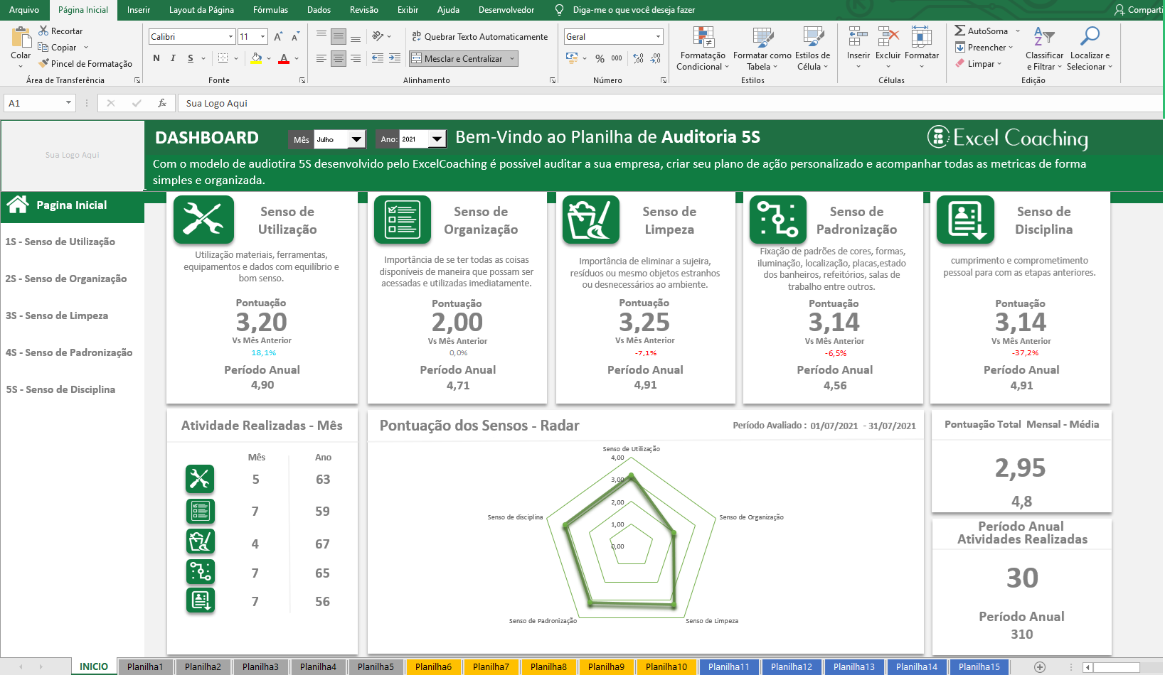 Com a Planilha Auditória 5S ou Planilha Método Kaisen você conseguirá realizar a gestão das atividades de sua empresa baseado no metodologia Kaizen (5S). Seguindo os 5 sensos do método Kaizen: Seiri, Seiton, Seiso, Seiketsu e Shitsuke. Os 5 sensos do método 5S: Senso de Utilização, Senso de Organização, Senso de Limpeza, Senso de Padronização e Senso de Autodisciplina.