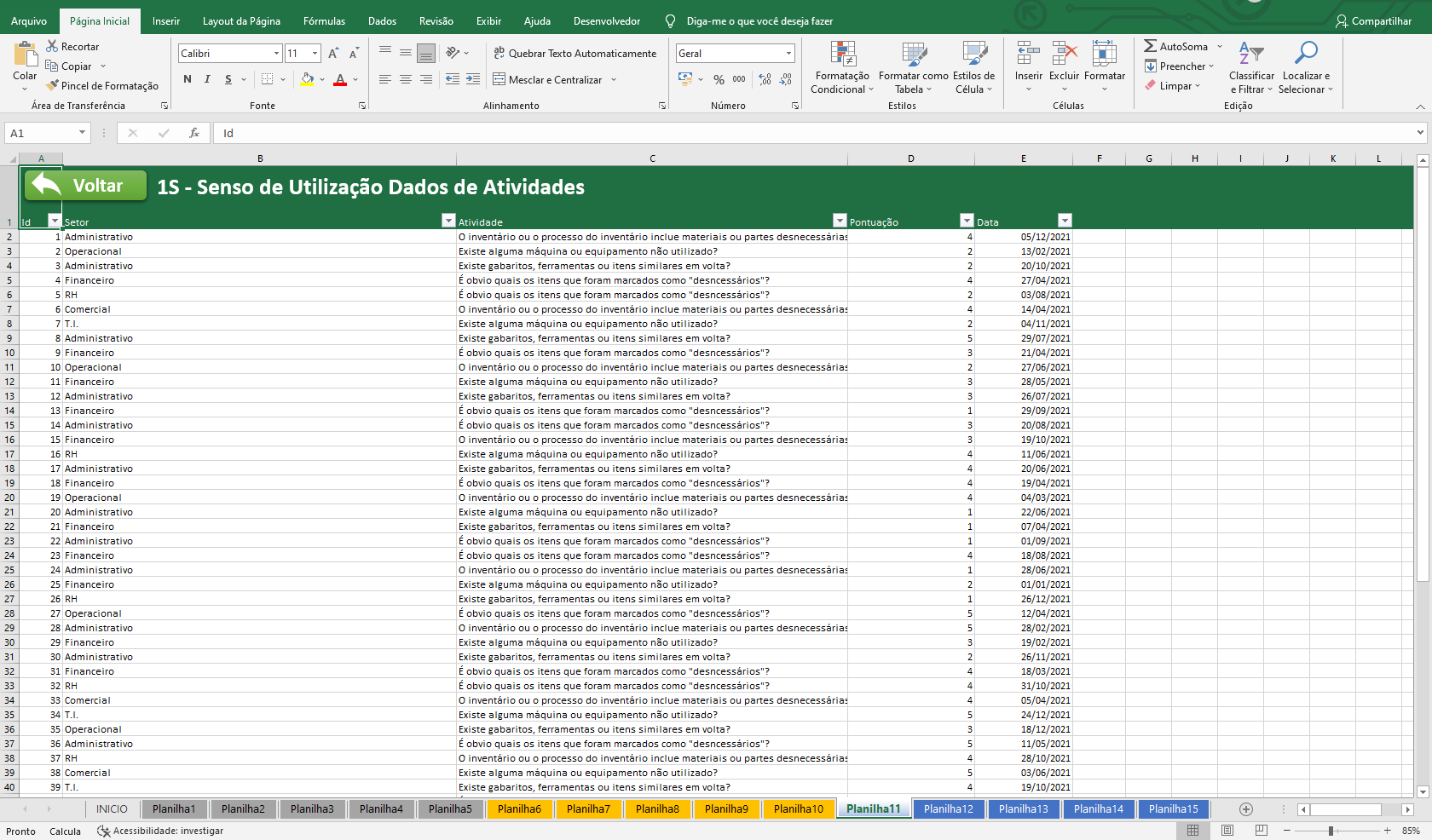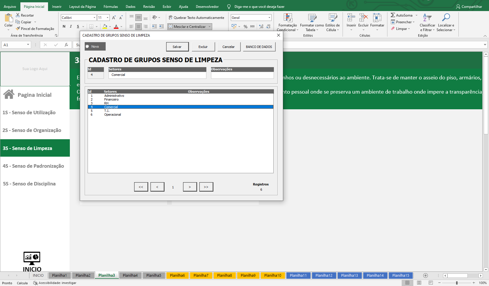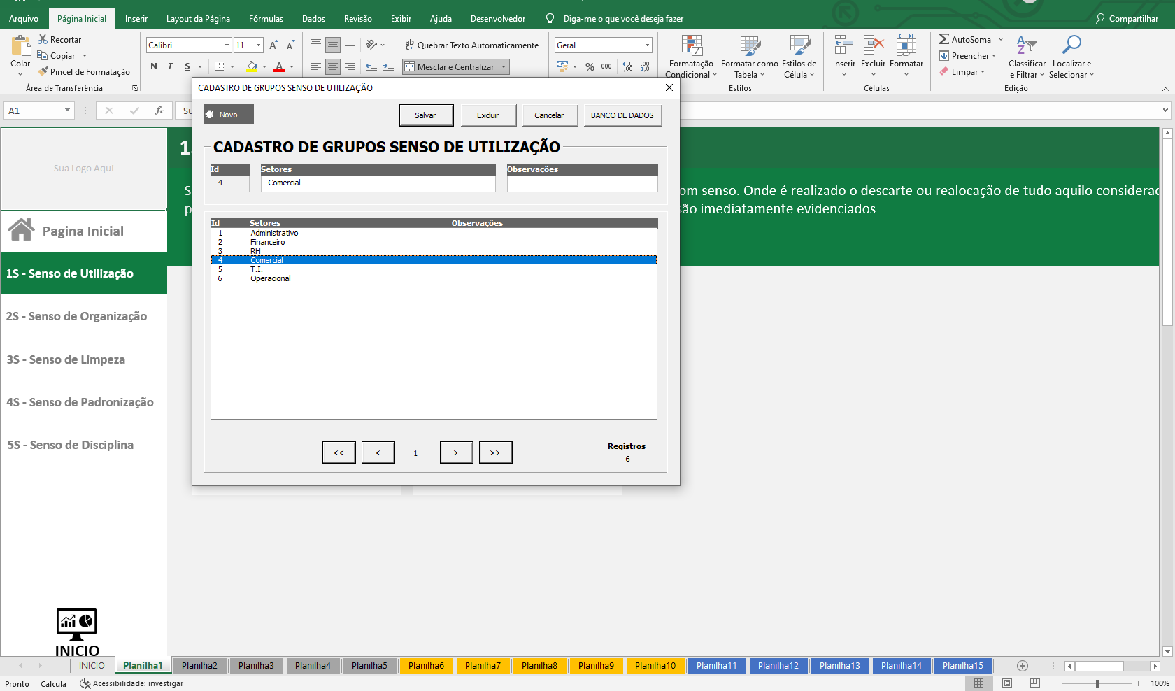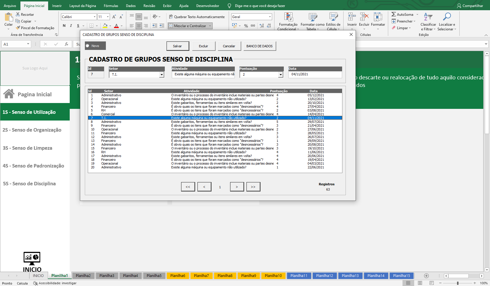 14. Planilha em VBA com formulários para cadastro de setores e atividades por cada senso.