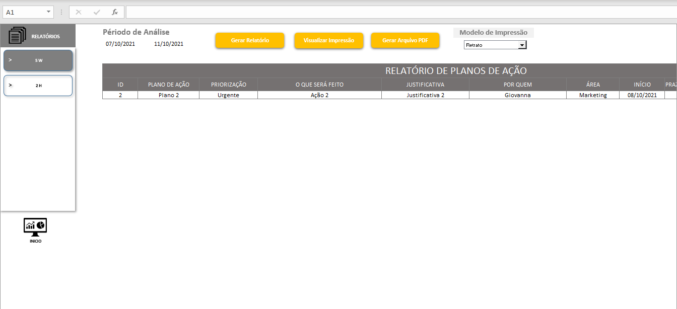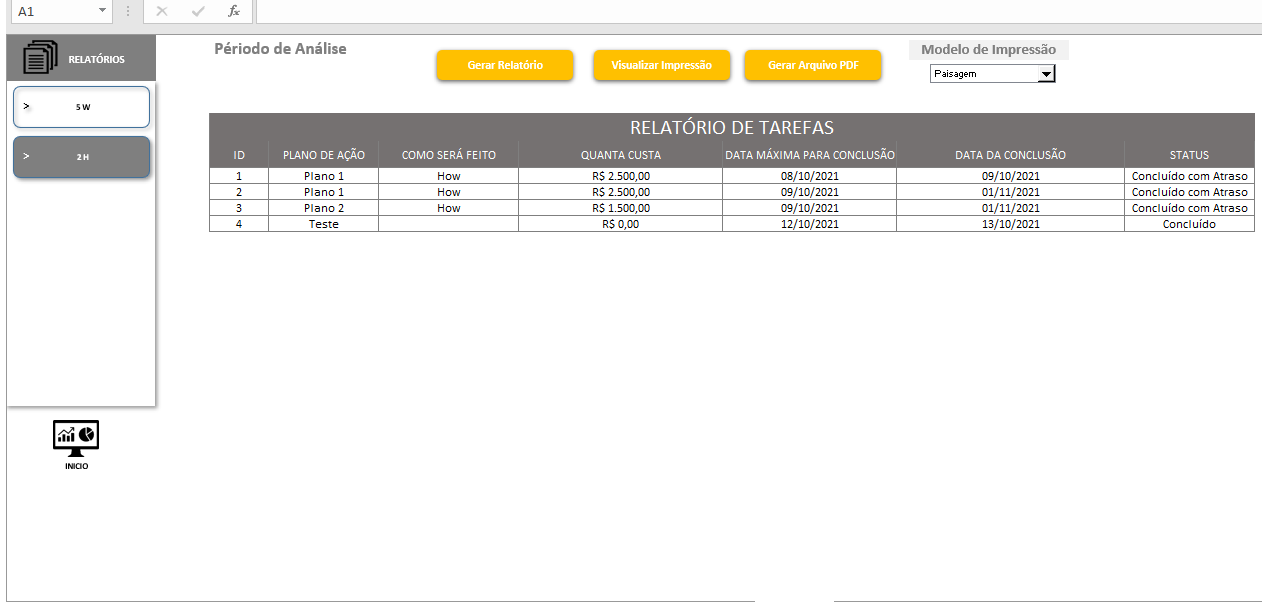 Dashboard Inicial da Planilha Plano de Ação 5W2H: